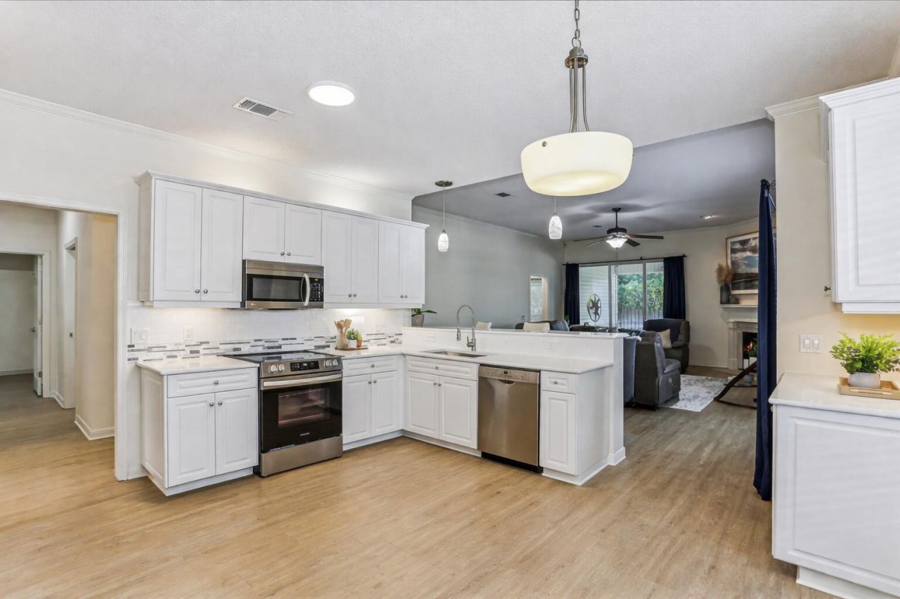 Less Maintenance, More Living! Spend weekends on the golf course or at the beach instead of mowing the lawn. Situated on a low-maintenance lot, this beautifully updated 3-bedroom, 2-bath home offers a lock-and-leave lifestyle without sacrificing comfort. Located in a desirable golf cart community near Tiger Point Golf Club and less than half a mile from Tiger Point Park, you're close to recreation, shopping, and dining. Inside features 10-foot ceilings, fresh paint, and a versatile flex space ideal for a 4th bedroom, office, or nursery. The remodeled kitchen (2022) boasts quartz countertops and new appliances. Enjoy LVP flooring, updated baths, a climate-controlled 2-car garage, and a private fenced yard with a re-screened porch (2025).