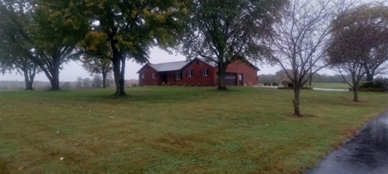 Beautiful view! Property is surrounded by farm land! 3 bedroom, 2 bath brick with 2200 sq. ft. and 2 car attached garage. 3.344 acres surveyed, 3600 sq. ft. building, can be used for many things. House has gas fireplace, laminate floors and 2 hot water heater and patio.